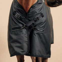 C’est important de bien choisir la taille de la couverture. Si elle est trop grande, elle risque de tourner et si elle est trop petite, le cheval risque de la déchirer. Pour que la couverture ne recule pas, il faut bien ajuster les sangles de poitrail. Les sangles ventrales croisées ainsi que les courroies de cuisses ne doivent pas être trop tendues ou trop lâches pour ne pas gêner le cheval ou risquer qu’il se prenne les postérieurs dedans et pour empêcher la couverture de glisser sur le côté.