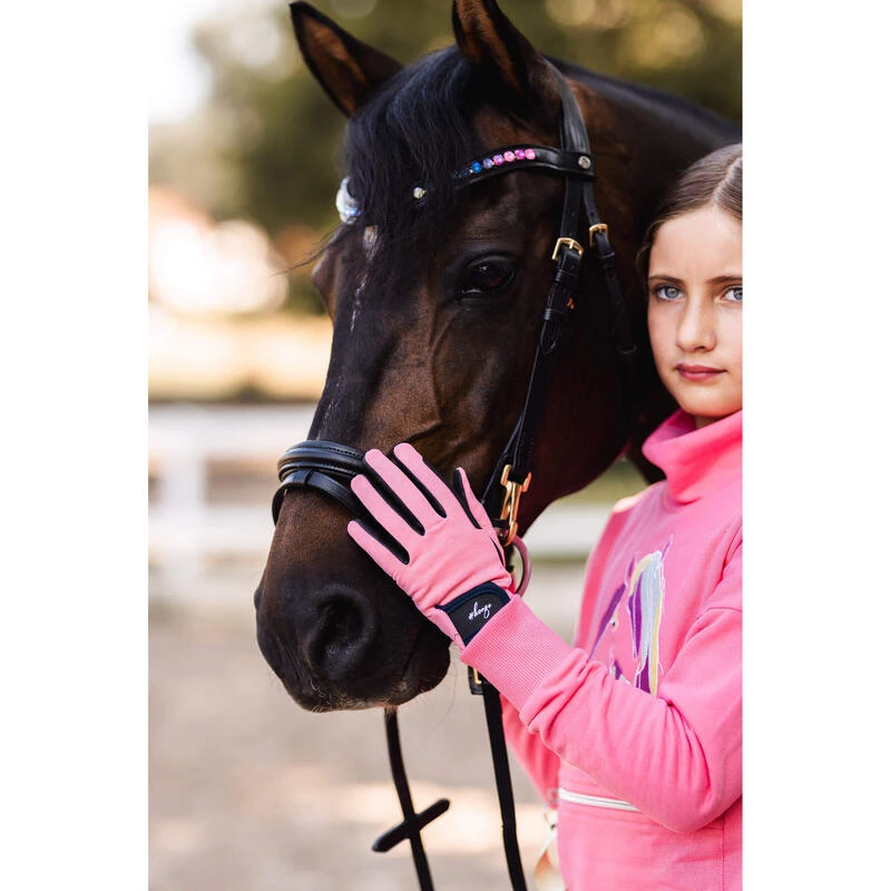 Découvrez les gants d’équitation pailletés Horze Finola pour fille, avec un dos élastique scintillant et la touche #Horze assortie. Confortables et libres de mouvement !