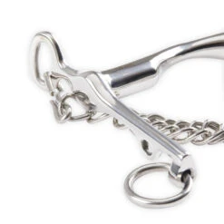 La gourmette doit être bien à plat et réglée de sorte que lorsque les rênes sont ajustées, les branches du mors basculent à 45° maximum avec les montants de la bride.